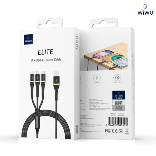 El cable Elite Wi-C011 de WIWU es una solución versátil y duradera para tus necesidades de carga y transferencia de datos. Diseñado con materiales de alta calidad, incluyendo cobre de 118 hilos y un refuerzo de cordón de nailon, este cable está construido para soportar más de 12000 curvas, garantizando una larga vida útil. Ofrece carga rápida de 2.4A y transmisión de datos eficiente. Su longitud de 1.2 metros te brinda comodidad, y su resistencia al agua lo hace ideal para el uso diario. DETALLES ADICIONALES: