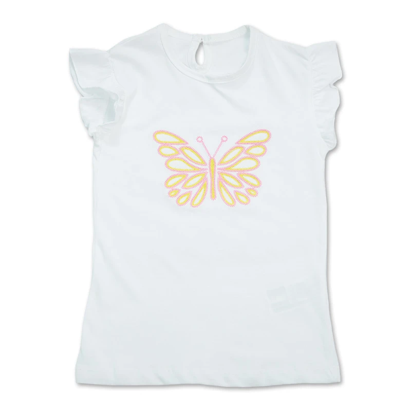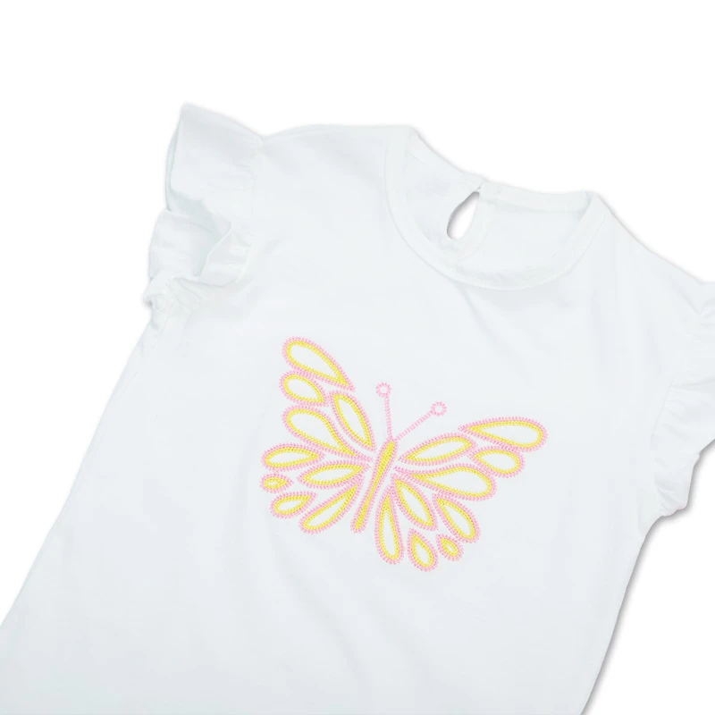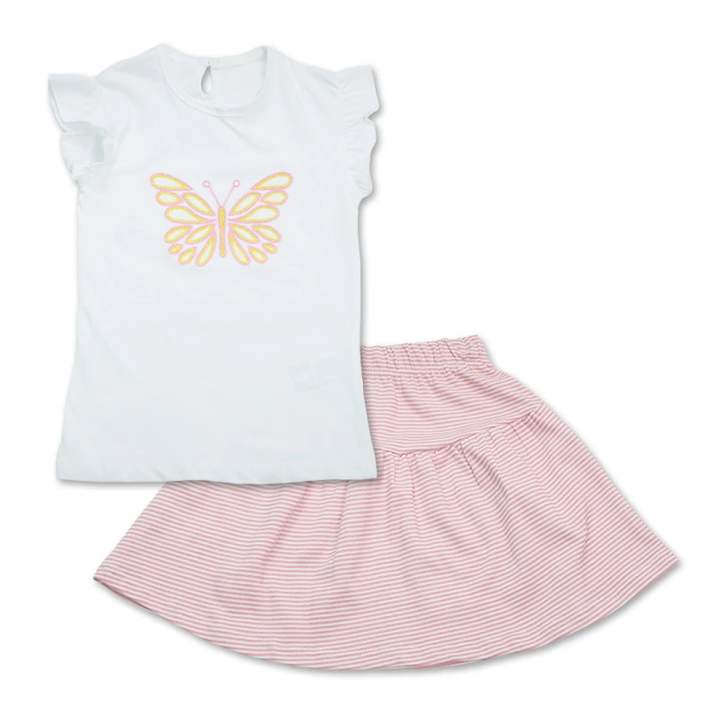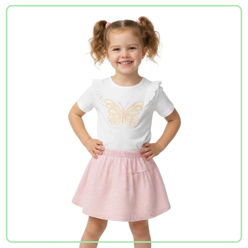 Este conjunto combina la suavidad del algodón con un diseño que cautiva. La falda de rayas y la blusa con bordado de mariposa crean un look adorable y versátil, perfecto para que tu hija disfrute cada momento con estilo y libertad. DETALLES ADICIONALES: