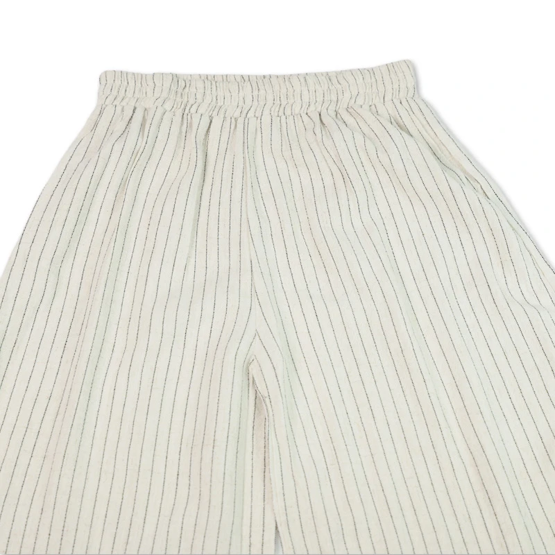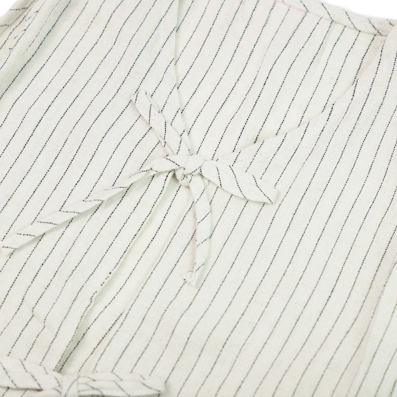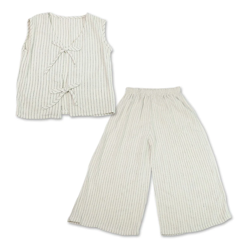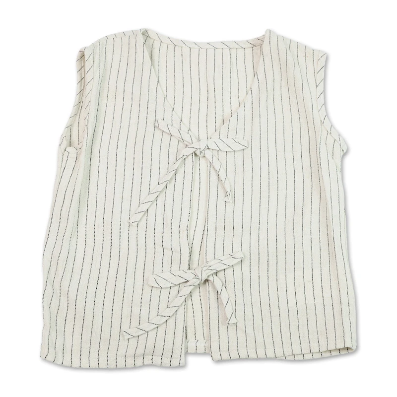 Ideal para los días casuales, este conjunto combina diseño y practicidad. Los lazos del chaleco no solo decoran, sino que permiten amarrar la prenda al pecho, asegurando un ajuste cómodo y seguro. El pantalón de rayas con pretina elástica completa un look adorable, permitiendo que tu hija se mueva libremente y disfrute cada momento con estilo y comodidad. DETALLES ADICIONALES:
